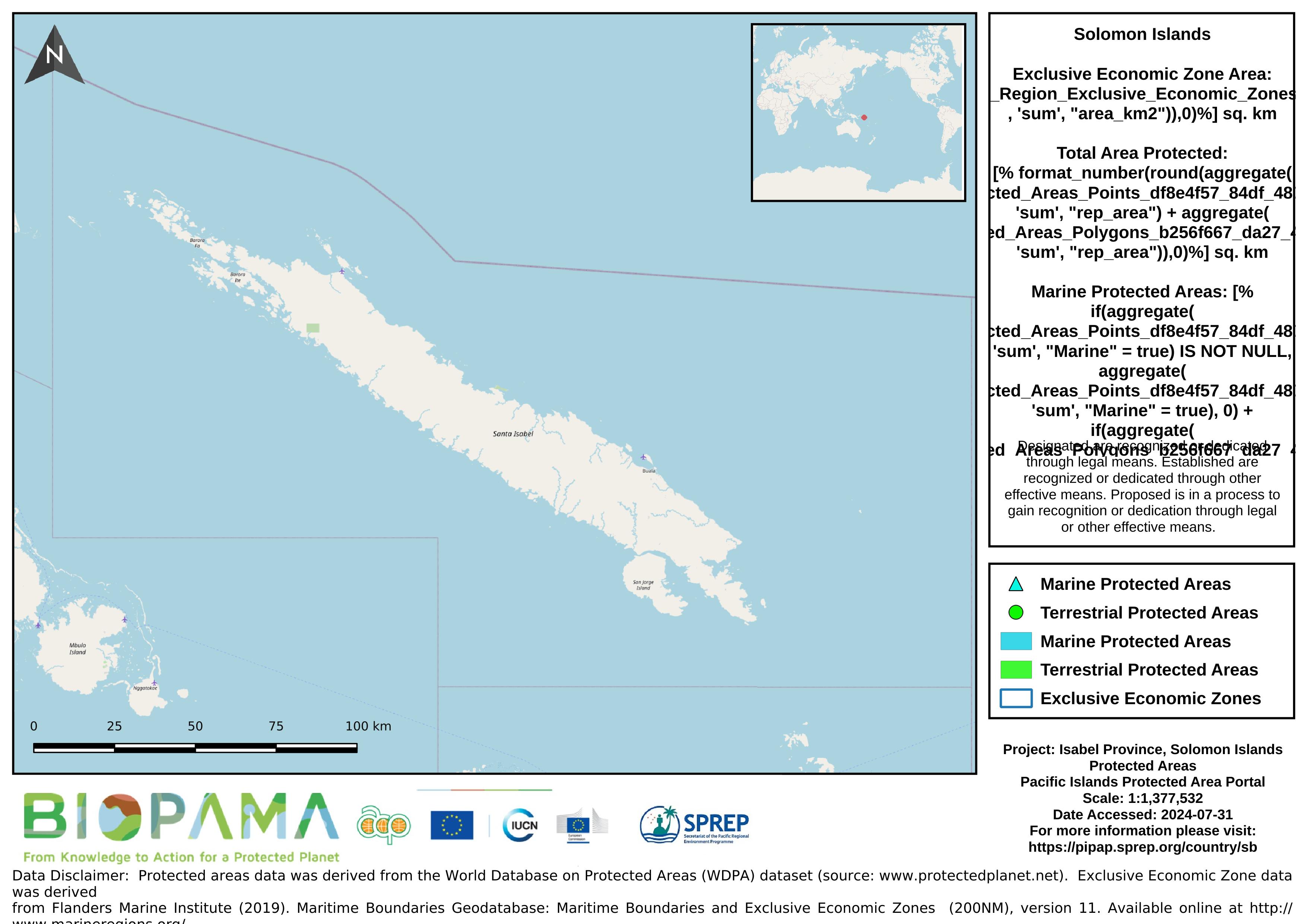 Map of the protected areas for Isabel province in the Solomon Islands with country-level summary statistics on the amount of area under protection, count for each type of protected area (terrestrial or marine), and the count of their designation.