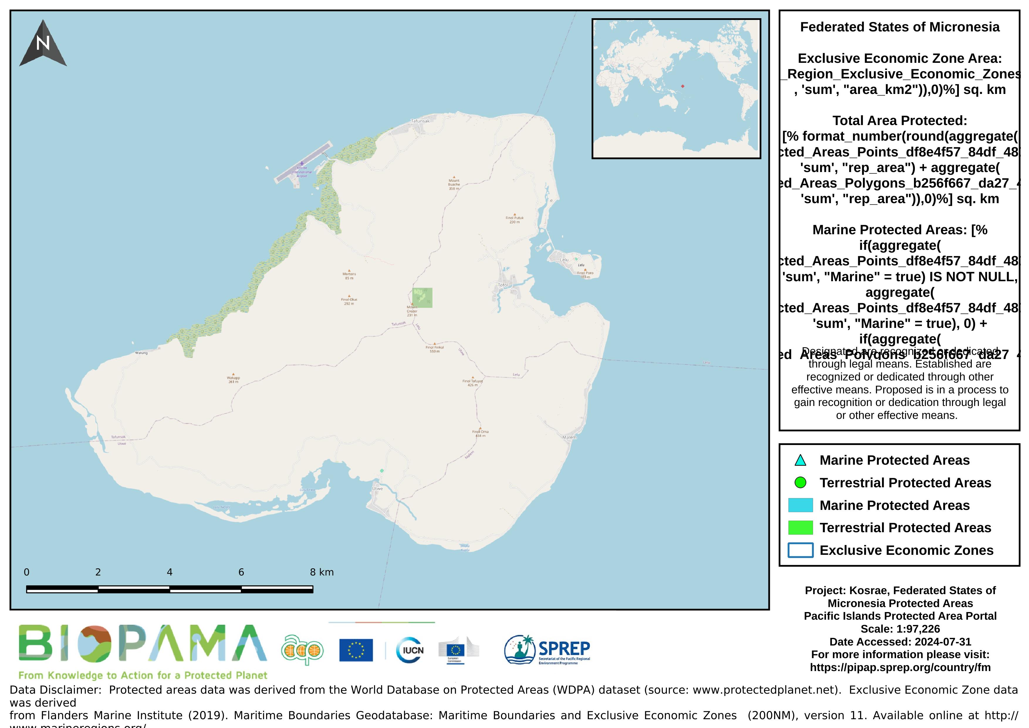 Map of the protected areas for Kosrae in the Federated States of Micronesia with country-level summary statistics on the amount of area under protection, count for each type of protected area (terrestrial or marine), and the count of their designation.