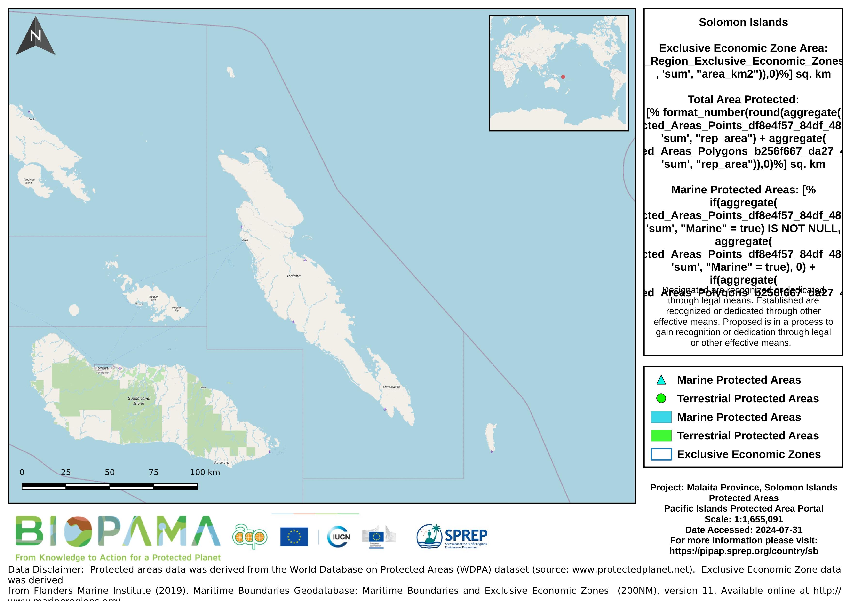 Map of the protected areas for Malaita province in the Solomon Islands with country-level summary statistics on the amount of area under protection, count for each type of protected area (terrestrial or marine), and the count of their designation.