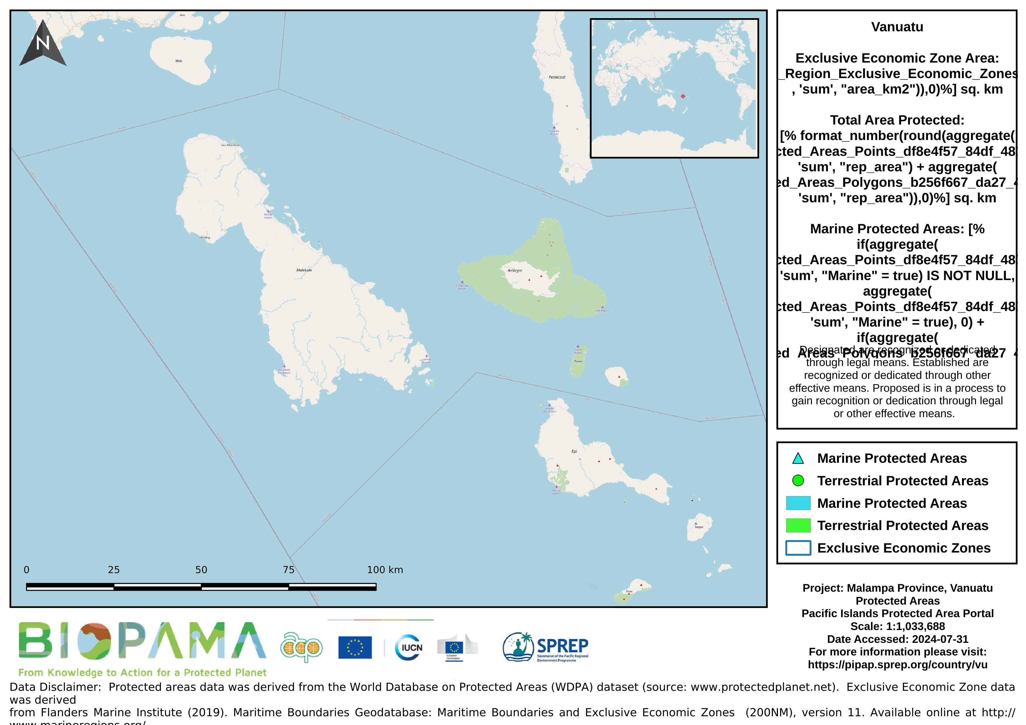 Map of the protected areas for Malampa Province, Vanuatu with country-level summary statistics on the amount of area under protection, count for each type of protected area (terrestrial or marine), and the count of their designation.