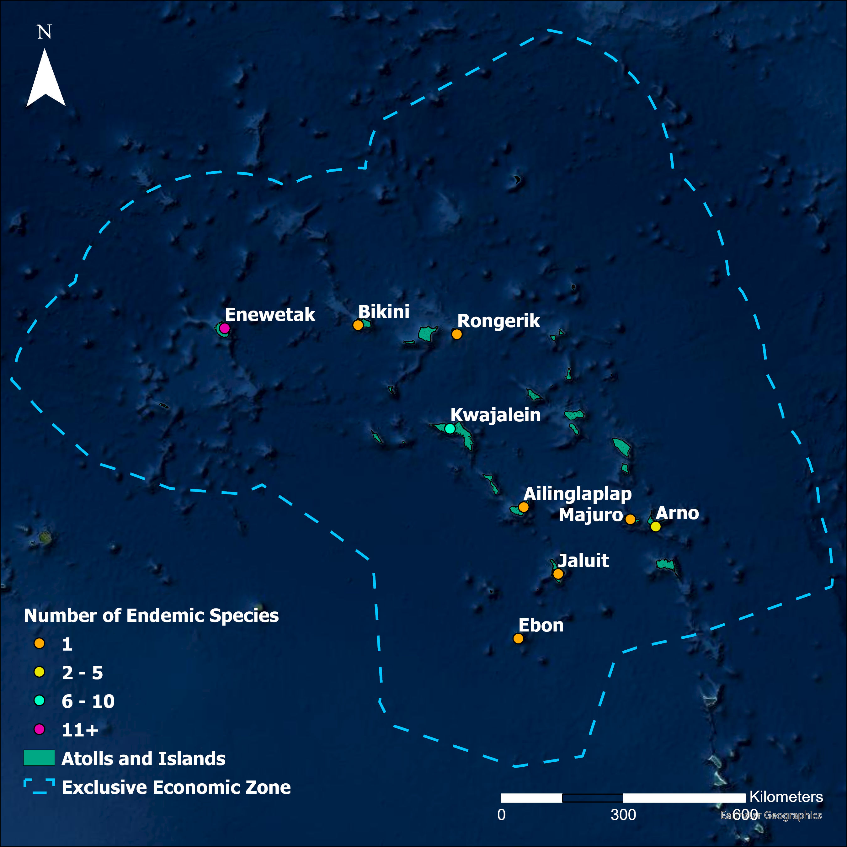 Map of number of endemic species per atoll within the Marshall Islands exclusive economic zone.