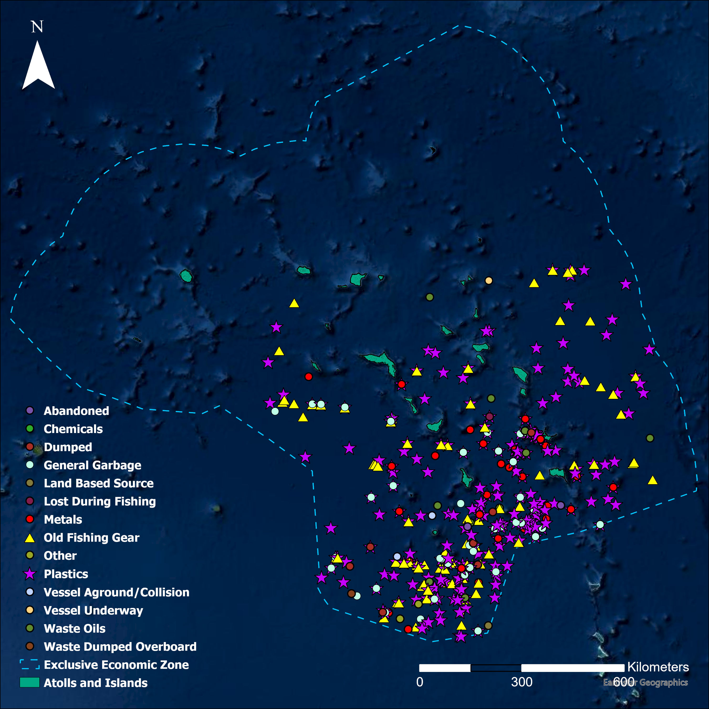 Map of observations of marine plastic pollution dumping from purse seine operations in the Marshall Islands.