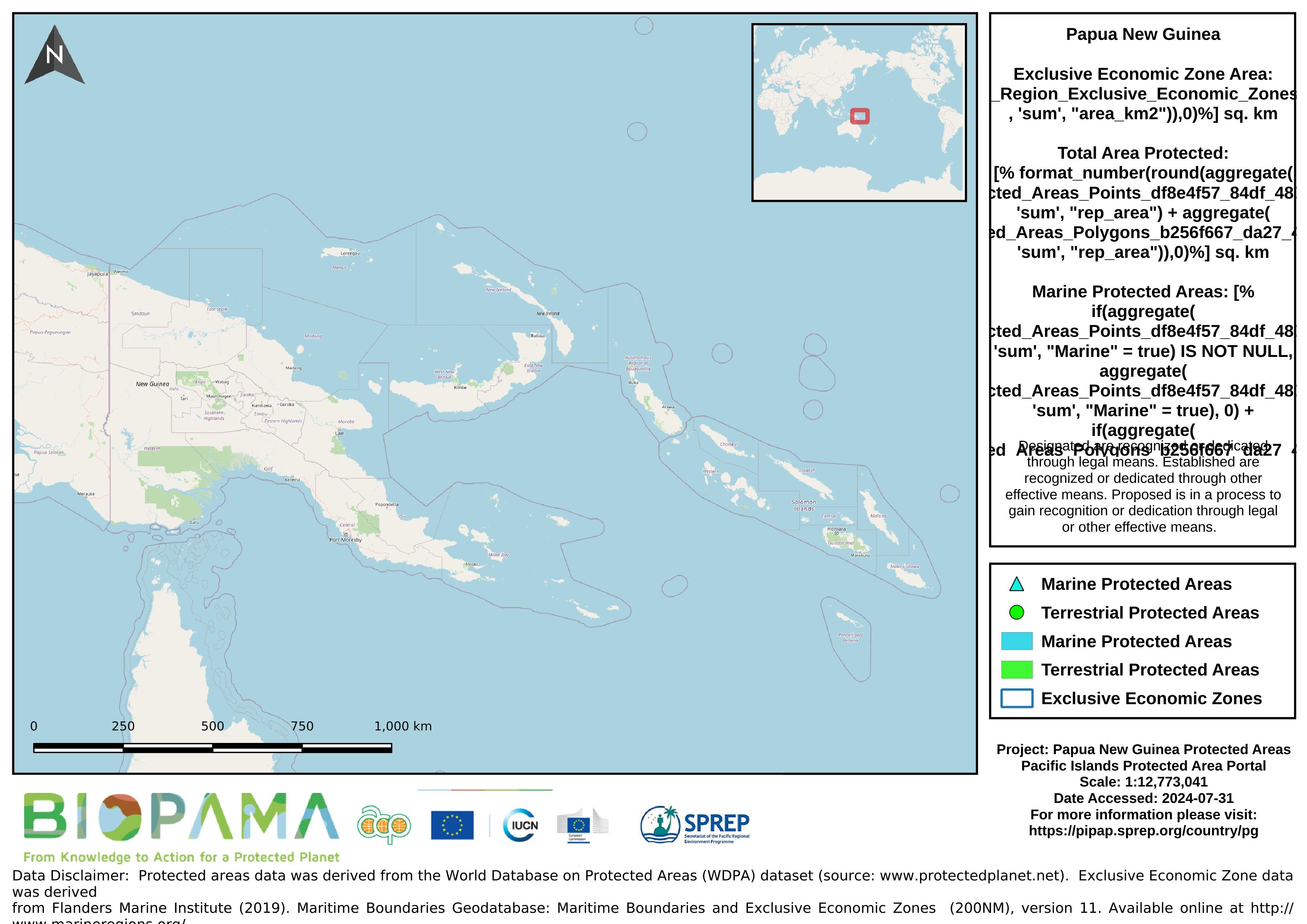 Map of the protected areas for Papua New Guinea with country-level summary statistics on the amount of area under protection, count for each type of protected area (terrestrial or marine), and the count of their designation.
