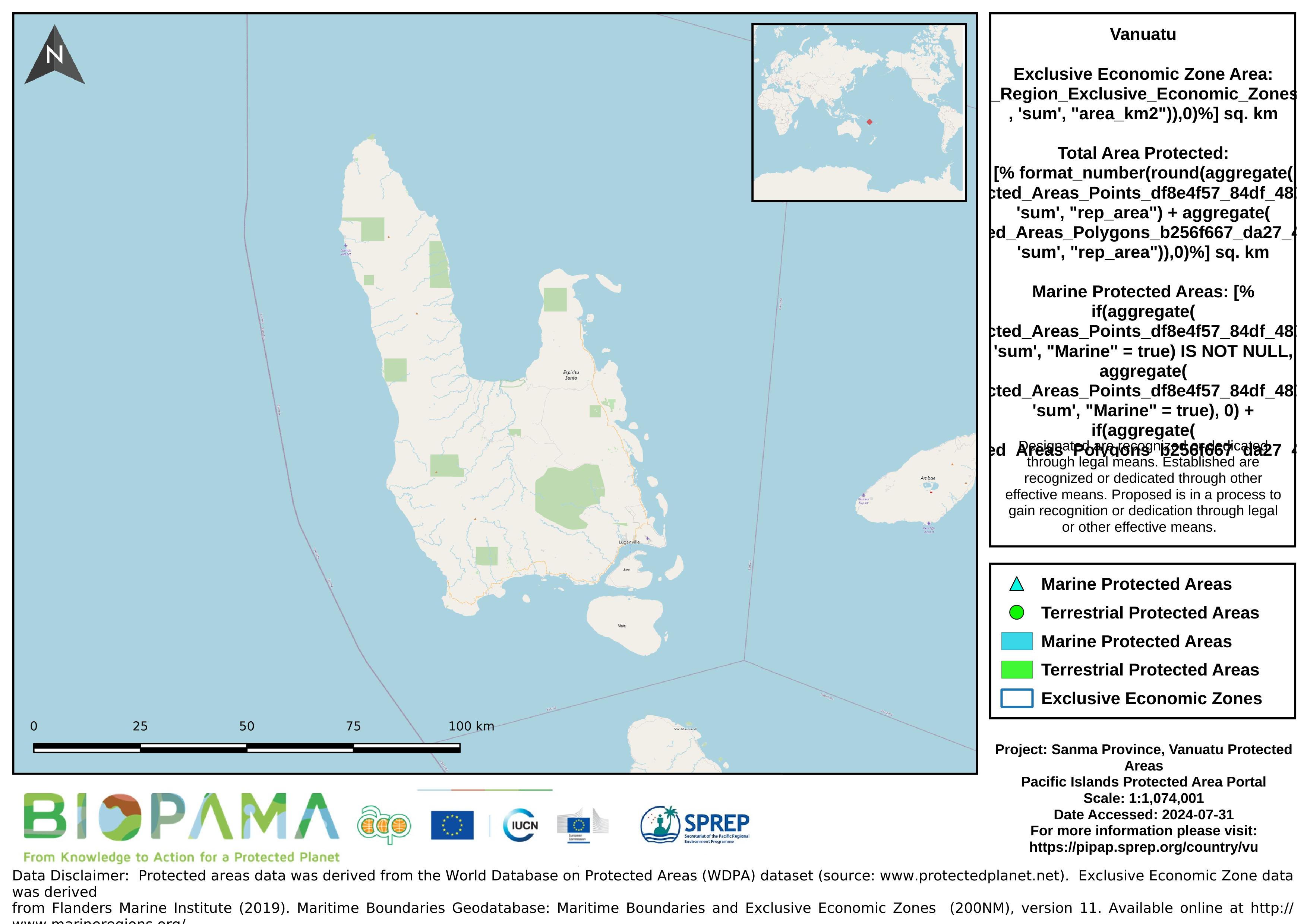 Map of the protected areas for Sanma Province, Vanuatu with country-level summary statistics on the amount of area under protection, count for each type of protected area (terrestrial or marine), and the count of their designation.
