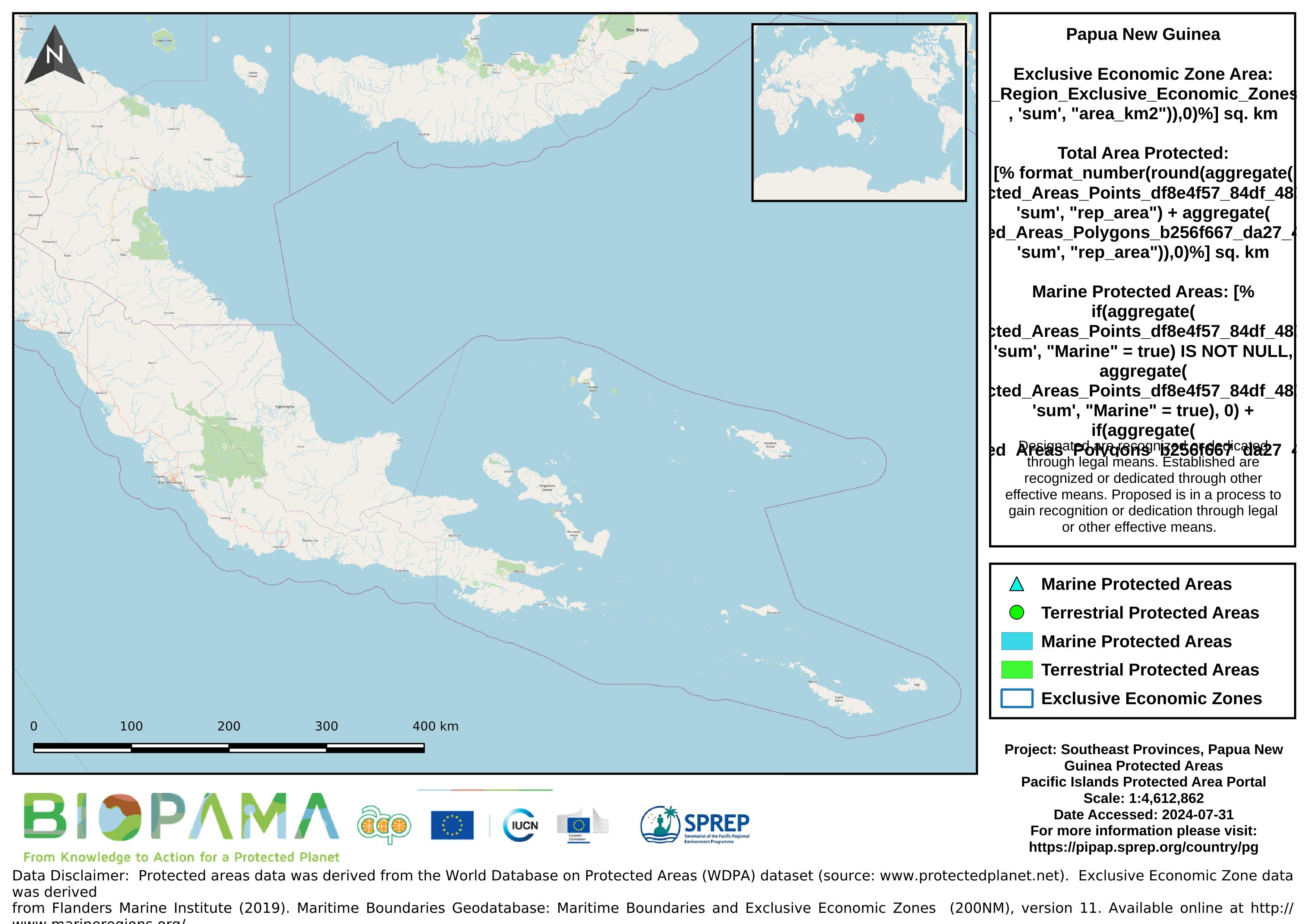 Map of the protected areas for the southeast provinces of Papua New Guinea with country-level summary statistics on the amount of area under protection, count for each type of protected area (terrestrial or marine), and the count of their designation.