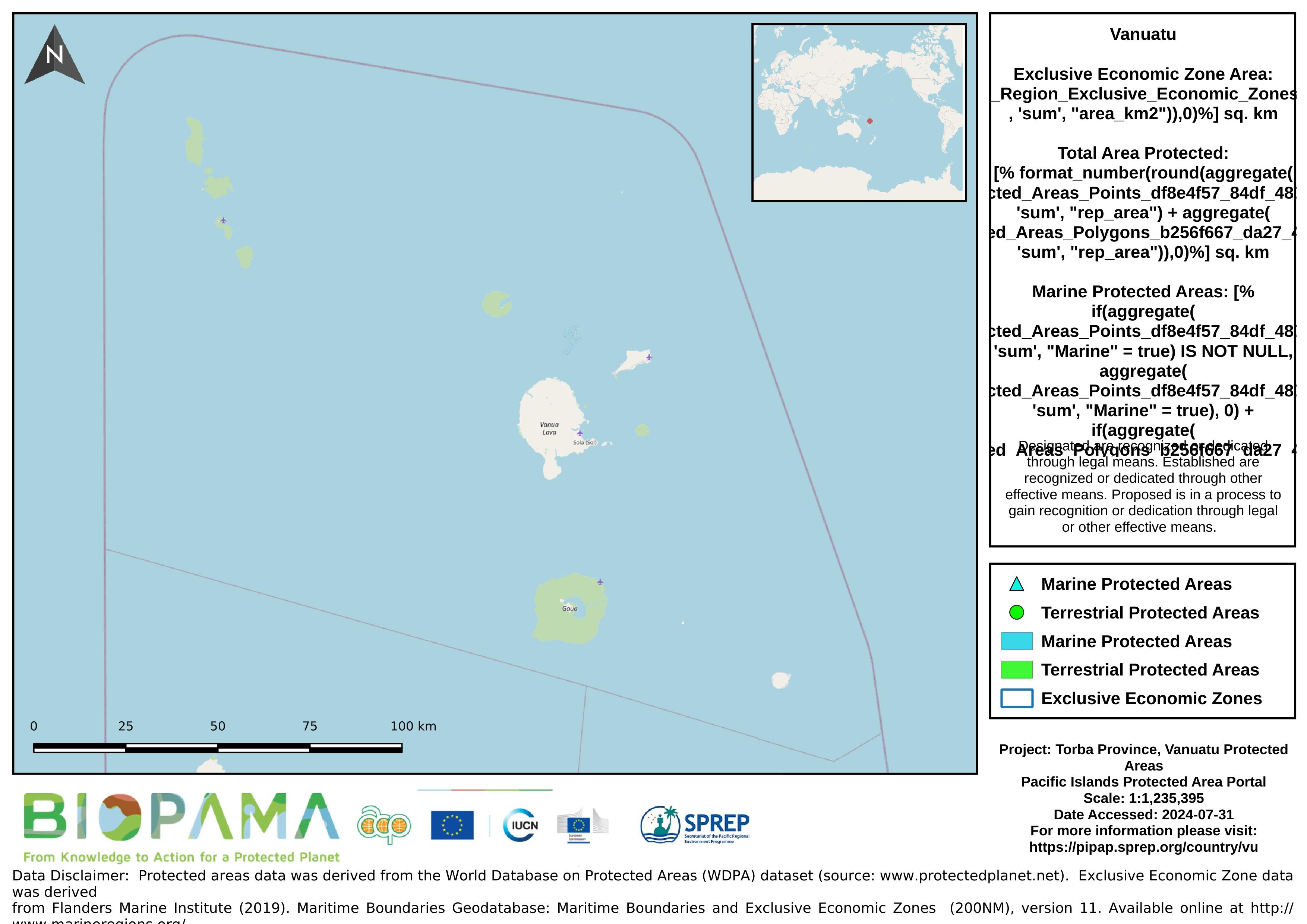 Map of the protected areas for Torba Province, Vanuatu with country-level summary statistics on the amount of area under protection, count for each type of protected area (terrestrial or marine), and the count of their designation.