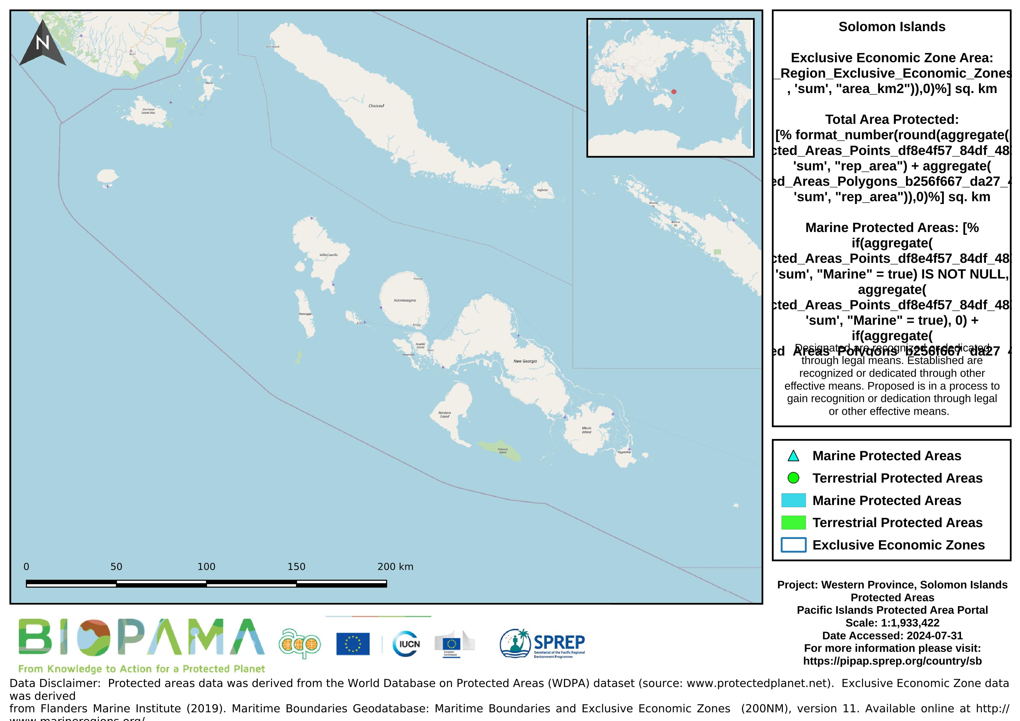 Map of the protected areas for Western province in the Solomon Islands with country-level summary statistics on the amount of area under protection, count for each type of protected area (terrestrial or marine), and the count of their designation.